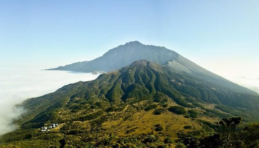 Mount Meru is a dormant stratovolcano located 70 kilometres west of Kilimanjaro in southeast Arusha Region, Tanzania. At a height of 4,562.13 metres, it is visible from Mount Kilimanjaro on a clear day, and is the fifth-highest of the highest mountain peaks of Africa, dependent on definition.